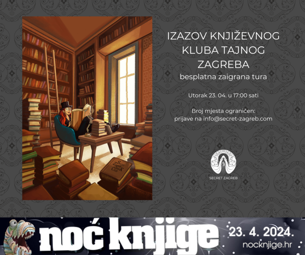 Književnici i njihovi likovi česta su tema obilazaka iz programa Secret Zagreb. Povodom Noći knjige, okupili smo sve te priče, pronašli neke nove i posvetili cijelu turu isključivo njima. Zajednički ćemo se prisjetiti onih koji su svojim riječima zidali ovaj grad. Možda već znate da su priče iz tajnog Zagreba katkad malo i uvrnute – nećemo vas razočarati ni ove večeri! Bit će tu mračnih misli naših književnika, zlosretnih sudbina, neuzvraćenih ljubavi, nedostižnih muza, neponovljive mašte, ali i mnogo simpatičnih dogodovština. Pridružite se šetnji, prođite ispod prozora naših pisaca i ponovo se inspirirajte njihovim vječnim riječima.